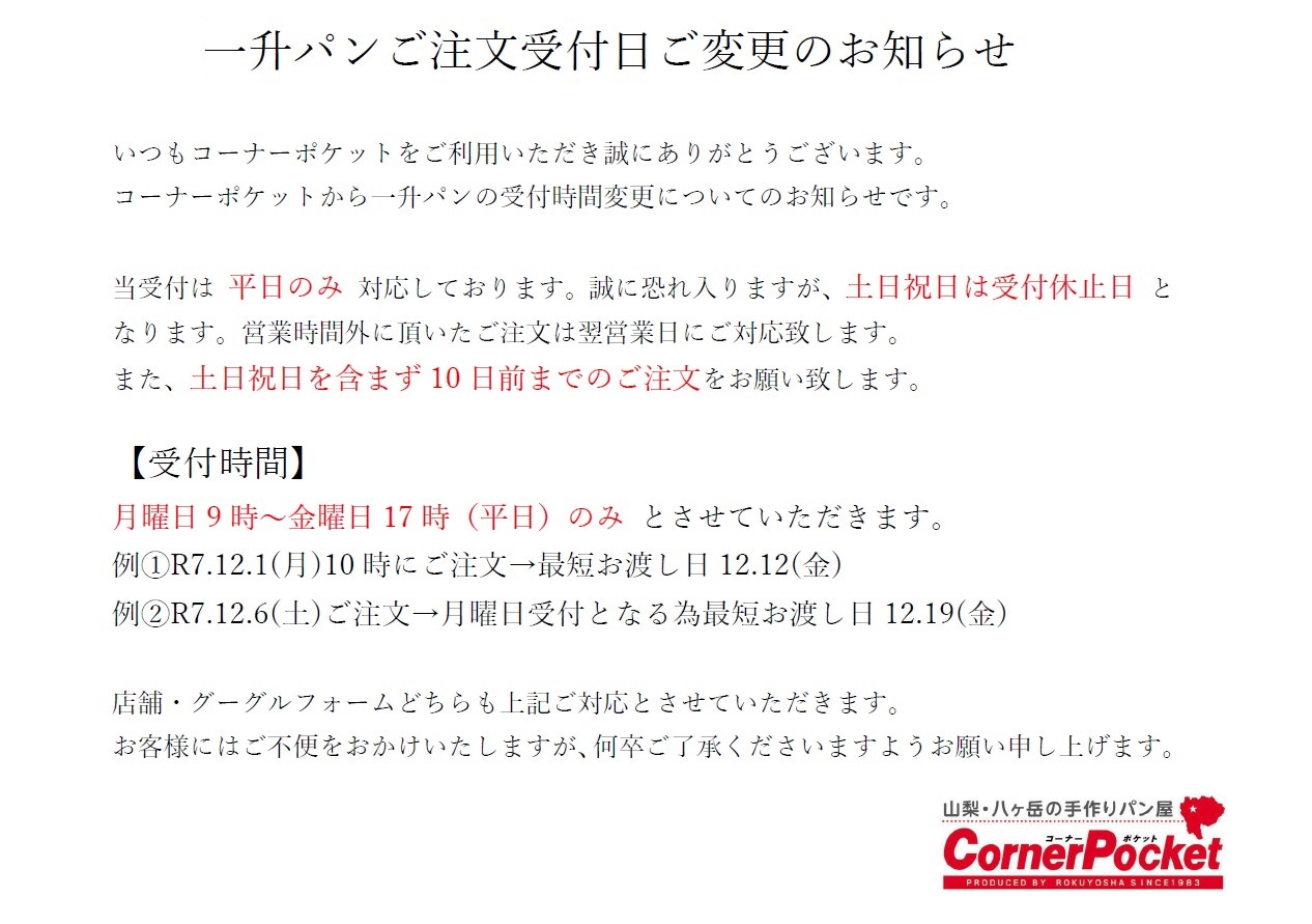 定休日新設に伴い一升パンのご注文受付日を下記の通り変更させていただきます。リードタイムにご注意していただきご注文をお願い致します。